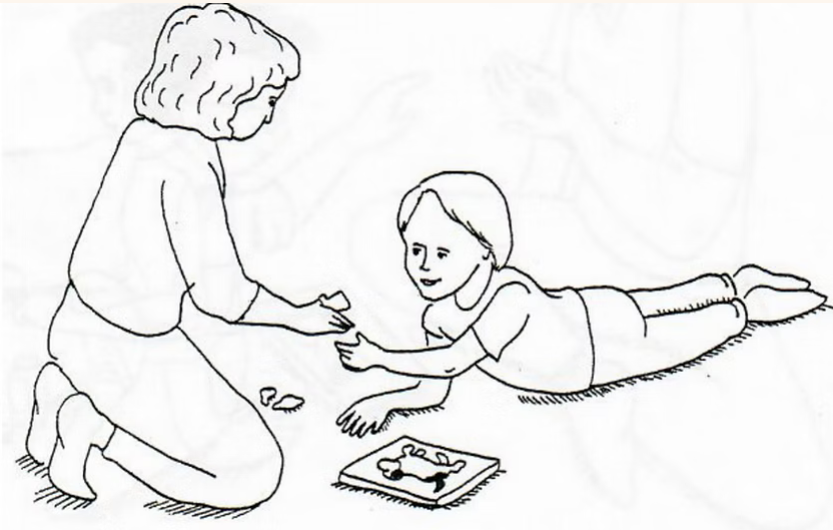 Have the child lie on the floor, supporting the body on the forearms. Present a puzzle piece so that the child must lift one arm to reach and take it. After the child places the piece in the puzzle, present another piece. Present the pieces directly in front and to either side so that the child must shift the weight to the other arm for support in order to reach. Repeat, having the child reach with the other hand as well.